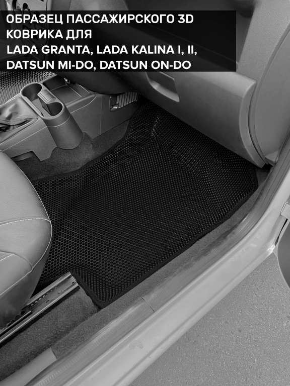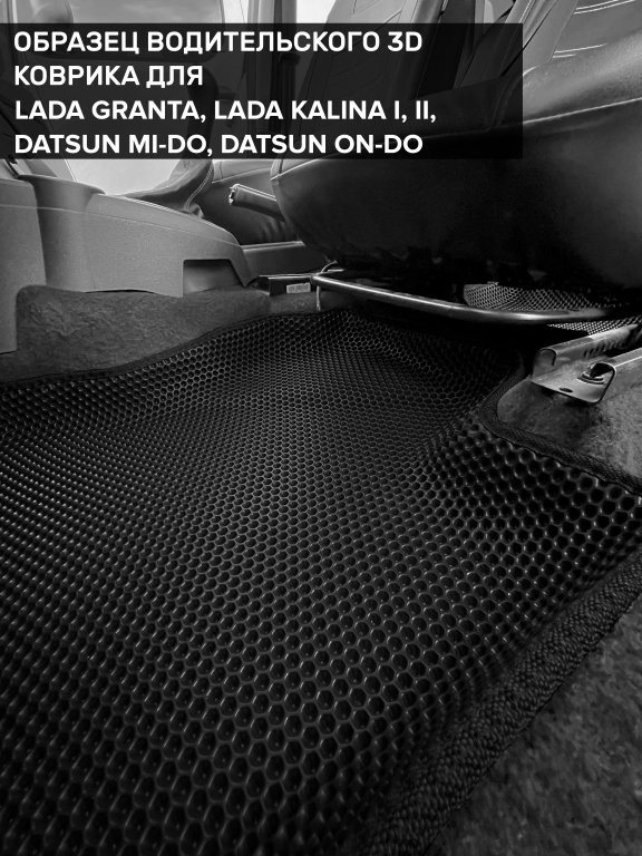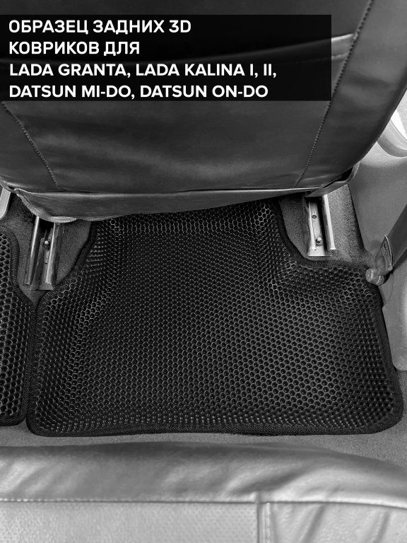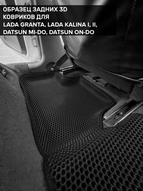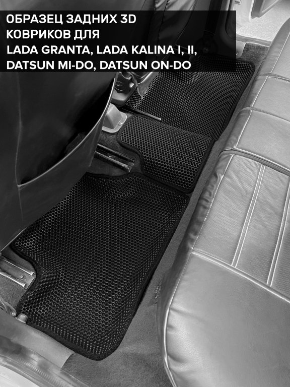 Автомобильные 3д коврики для Lada Kalina I седан, хэтчбек, универсал (2004-2013) в салон авто и багажник сделаны из инновационного полимерного материала EVA, изысканная структура в виде ячеек не дает воде, пыли и снегу разлетаться по салону машины и багажнику. 3д коврики зафиксированы на полу определенными клипсами, соответствующими Lada Kalina I седан, хэтчбек, универсал (2004-2013), и не двигаются в процессе езды.