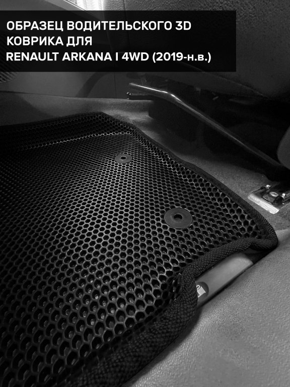 Автомобильные 3д коврики для Renault Arkana I 4WD (2019-н.в.) в салон авто и багажник сделаны из инновационного полимерного материала EVA, изысканная структура в виде ячеек не дает воде, пыли и снегу разлетаться по салону машины и багажнику. 3д коврики зафиксированы на полу определенными клипсами, соответствующими Renault Arkana I 4WD (2019-н.в.), и не двигаются в процессе езды.